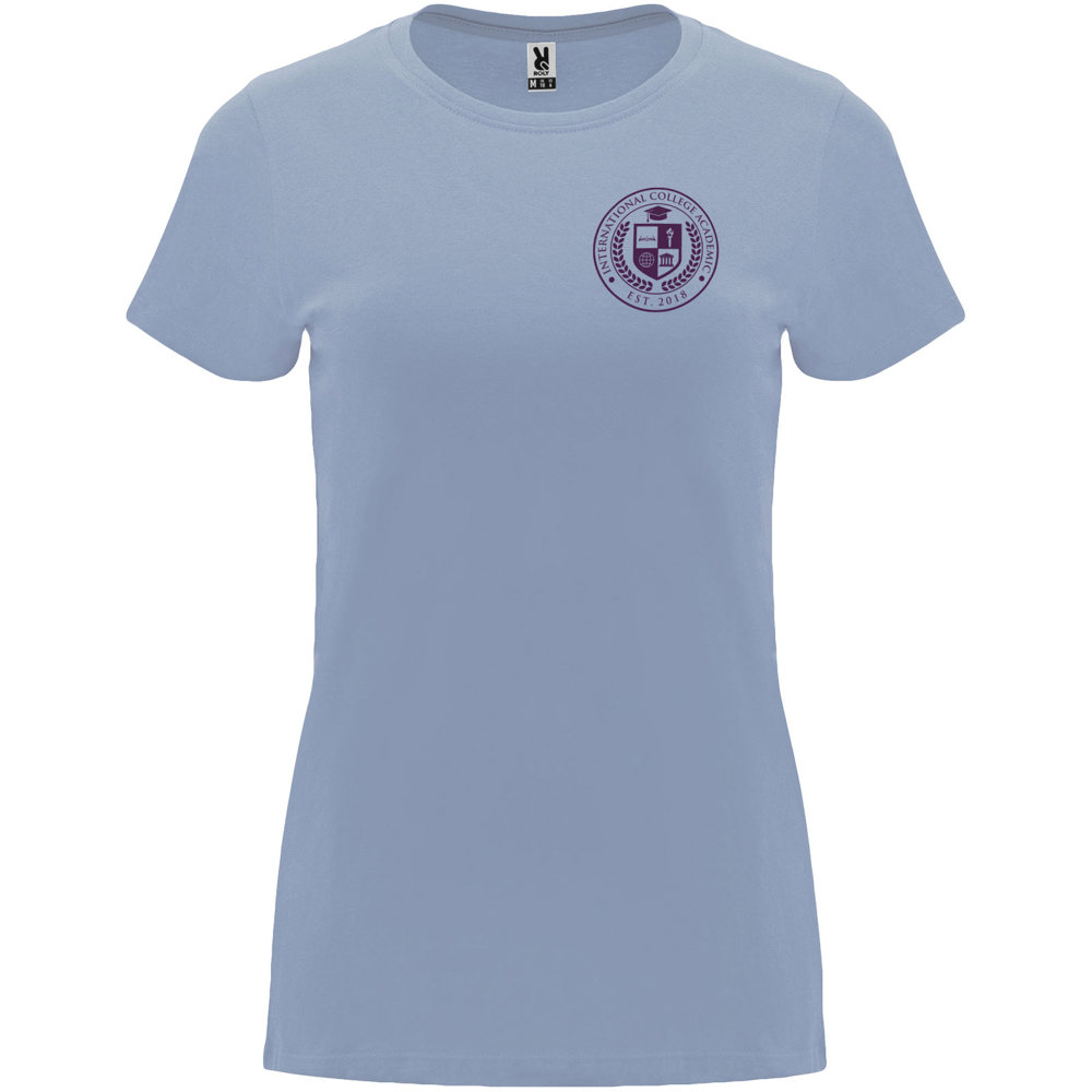 Getailleerd T-shirt met korte mouwen voor dames. 1x1 geribde ronde hals. Versterkte bedekte naden in de kraag. Verwijderbaar etiket.