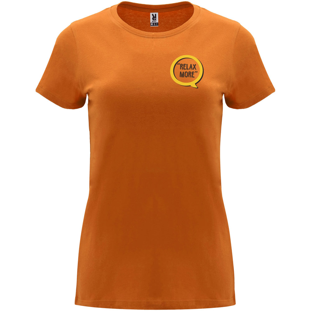 Getailleerd T-shirt met korte mouwen voor dames. 1x1 geribde ronde hals. Versterkte bedekte naden in de kraag. Verwijderbaar etiket.