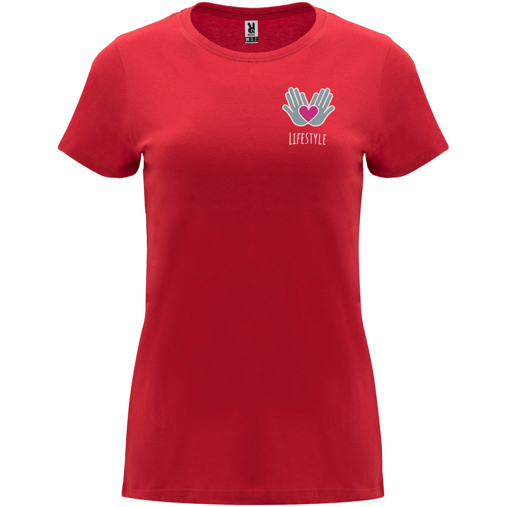 Getailleerd T-shirt met korte mouwen voor dames. 1x1 geribde ronde hals. Versterkte bedekte naden in de kraag. Verwijderbaar etiket.
