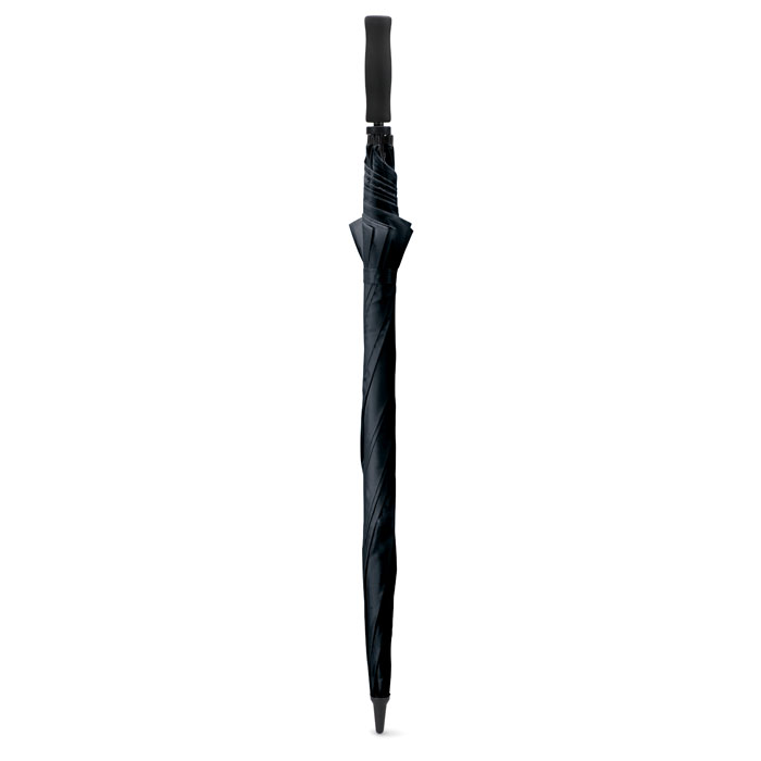 30 Inch windbestendige golfparaplu. 190T polyester, glasvezel steel en baleinen. Zwart kunststof uiteinden. EVA handvat. Opent en sluit handmatig.