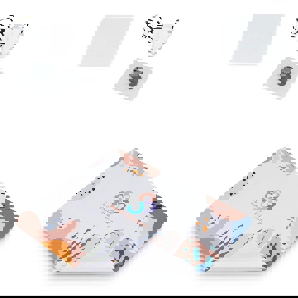 125 pagina's wekelijkse bureauplanner in 6 talen (EN/DE/FR/ES/IT/NL/PL) met kraftpapier omslag, kartonnen drukknoppen met blauwe inkt, houten liniaal en sticky note memoblokje.