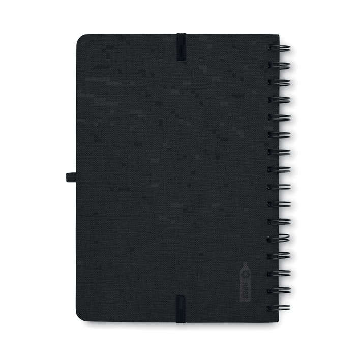 A5-notitieblok met harde 600D RPET-kaft met smartphone-standaardfunctie. Twin-wiro. 160 gelinieerde pagina's (80 vellen). 70 grams gerecycled papier. Elastische sluitingsband.