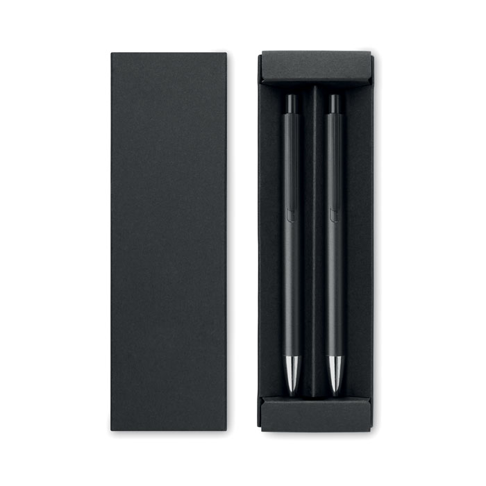 Gerecycled aluminium pennenset met 1 balpen blauwschrijvend en 1 pen grafiet inktloos. In gerecycled papieren doosje.