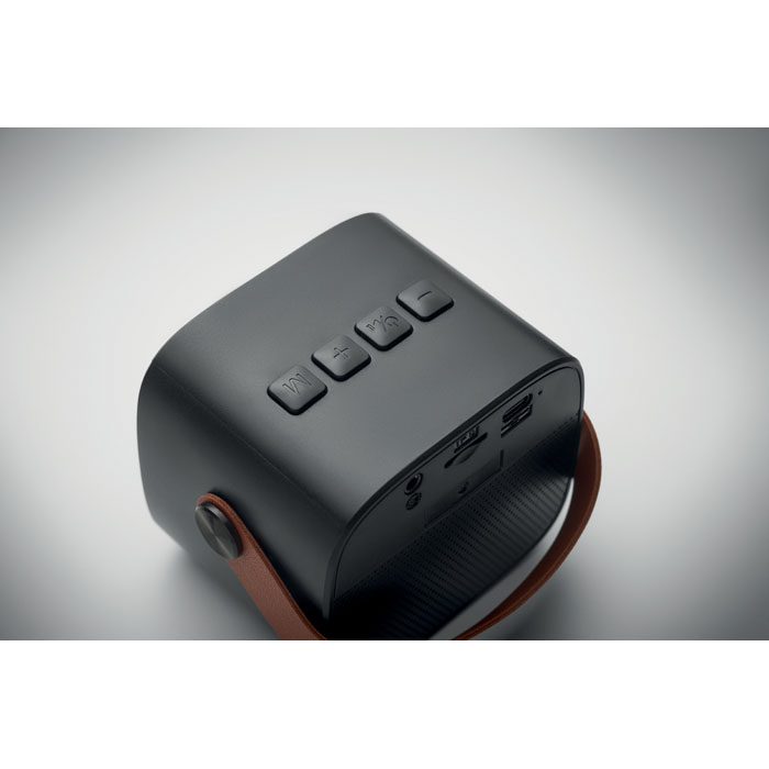 5.0 draadloze speaker in gerecycled ABS met PU handvat. 1 oplaadbare Li-ION-batterij van 500 mAh inbegrepen. Inclusief een SD-kaartpoort en een AUX/USB-kabel. Outputgegevens: 5W, 3 Ohm en 5V. Speeltijd ca. 4 uur.