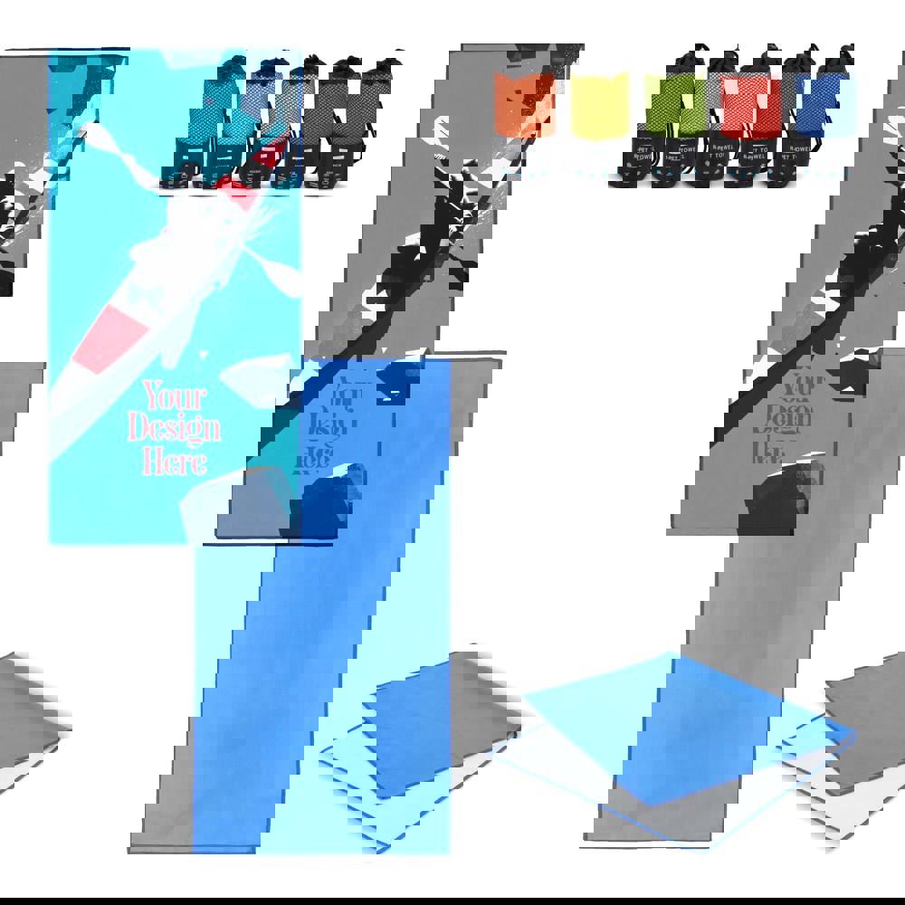 Microvezel handdoek van 90% polyester en 10% polyamide met elastische ophanglus. Lichtgewicht en sneldrogend. Afmeting 100cm x 150cm.