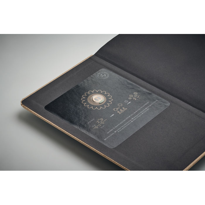 A5-notitieboekje met 184 gelinieerde pagina's (92 vel) van gerecycled papier. Katoenen bladwijzer. Inclusief zaaigoed. Dit duurzame notitieboekje heeft een lage impact op het milieu en is een geweldige promotionele give-away. Plant de zaadjes en er zal een selectie van wilde bloemen/fruit groeien. De kleurcode geeft het soort zaad aan: Bosbes (04), Aardbei (05), Witte margriet (13), Appel (48) en Dennenboom (60). Gemaakt in de EU.