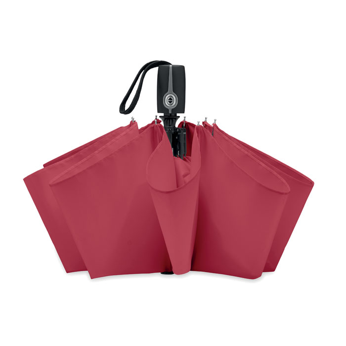 Luxe 21 inch stormparaplu van 190T polyester en pongee. Chroom metalen frame, zwarte baleinen van glasvezel en chroom metalen uiteinden. Rubberen ABS handgreep met grijze knop. In 3 delen opvouwbaar. Inclusief bijpassend hoesje. Opent en sluit automatisch.