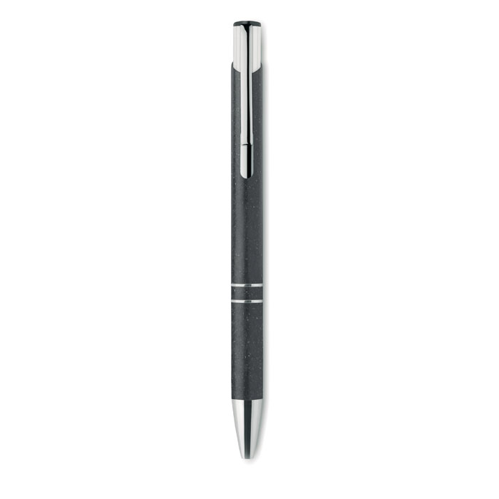 Balpen met drukmechanisme en zilveren details. Behuizing is van 50% tarwestro en 50% ABS-materiaal. Blauwe inkt.