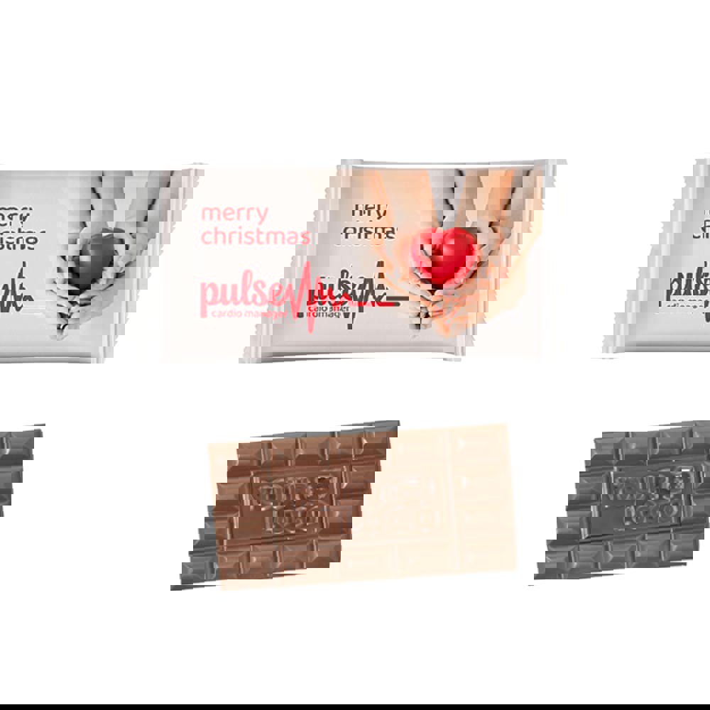 Vierkant chocolaatje, van eerste kwaliteit, waarvan de wikkel naar uw wens wordt bedrukt.
