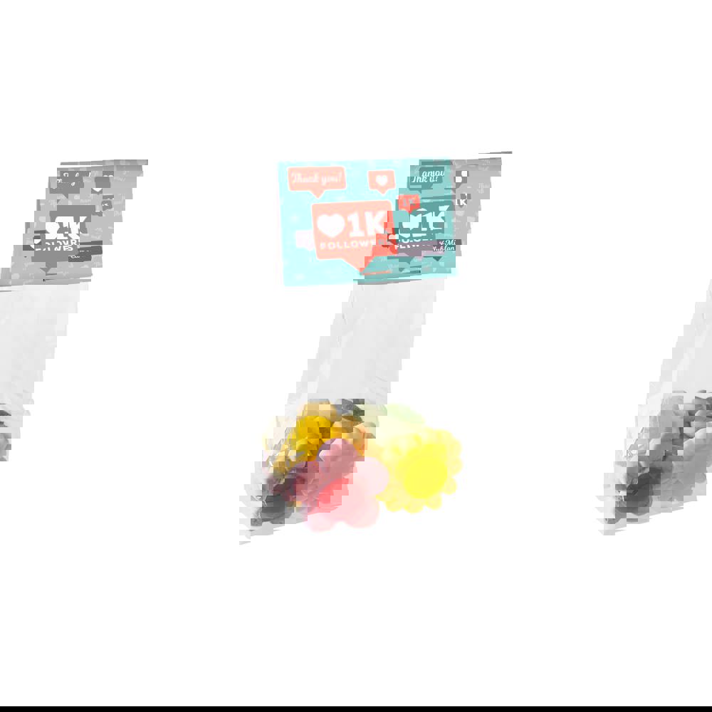 Transparant blokzakje met full colour bedrukt kopkaartje, gevuld met ca. 50 gram Vruchtenhartjes