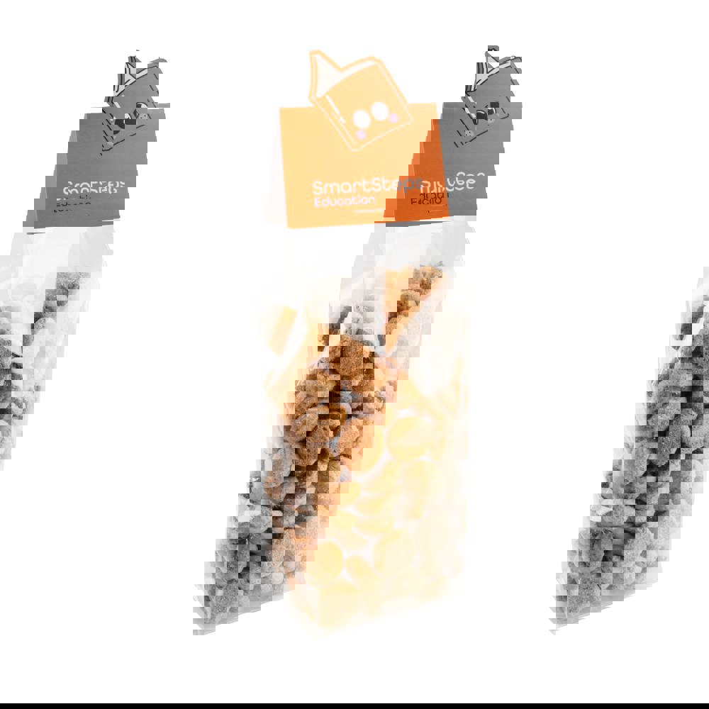 Transparant blokzakje met full colour bedrukt kopkaartje in eigen vorm, gevuld met 150 gram Mini Choco's