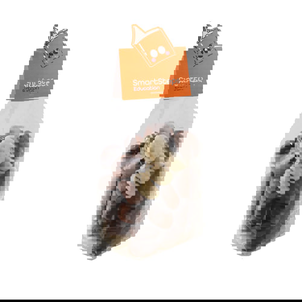 Transparant blokzakje met full colour bedrukt kopkaartje in eigen vorm, gevuld met 150 gram Mini Choco's
