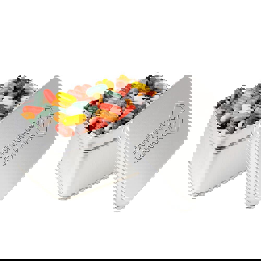 Bekertje van ongebleekt karton, gevuld met ca. 100 gram Vruchtenhartjes en voorzien van een full colour sticker met sluitzegel op de deksel