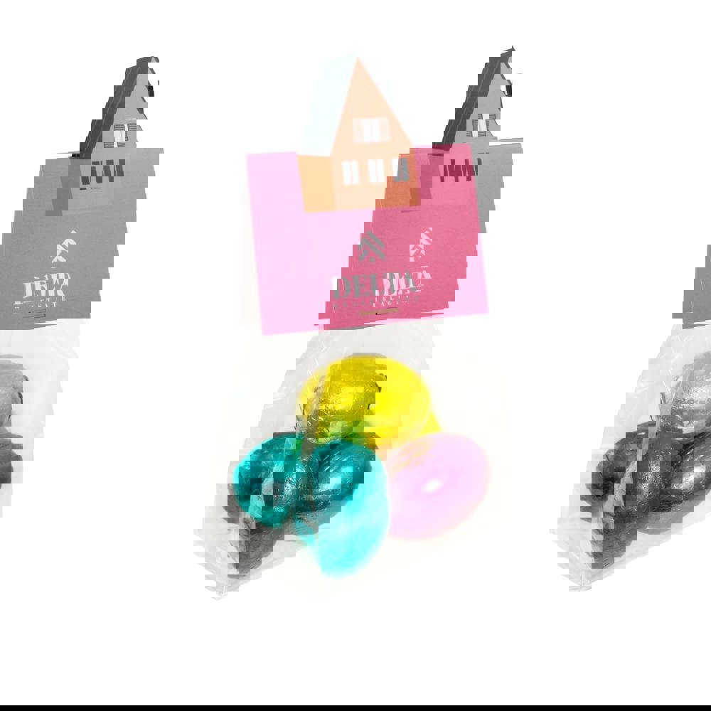 Transparant klikhulsje voorzien van een full colour sticker op één zijde, gevuld met ca. 10 gram Gekleurde Vuleitjes