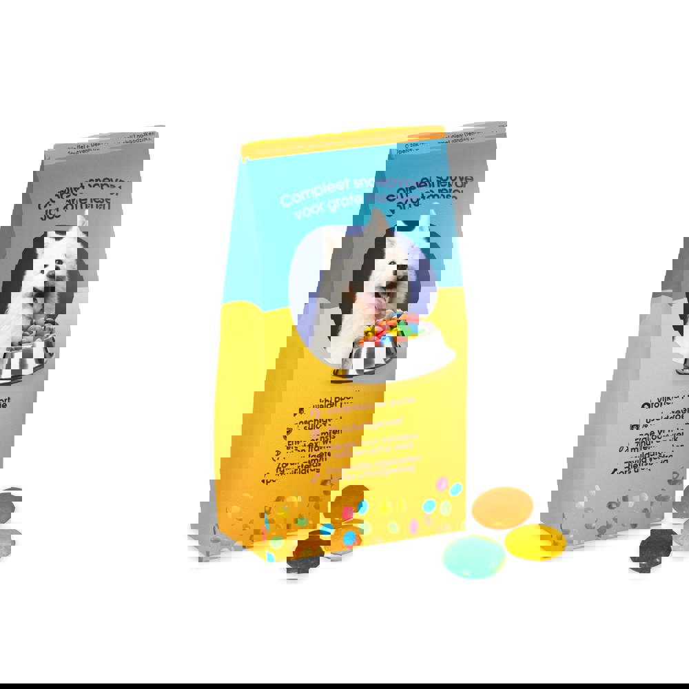 Voerzakje all-over full colour bedrukt, gevuld met ca. 30 gram Mini Choco's