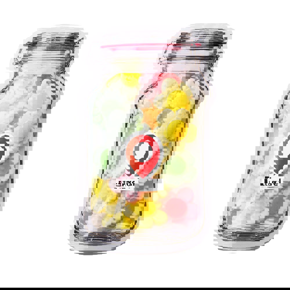 Mailing weckpot midi gevuld met Fruitsleutels en voorzien van een full colour sticker in eigen vorm