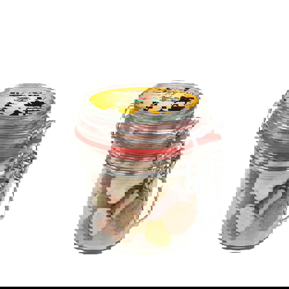 Weckpotje 0,25 liter gevuld met ca. 140 gram Tum Tum en voorzien van een full colour sticker op het deksel