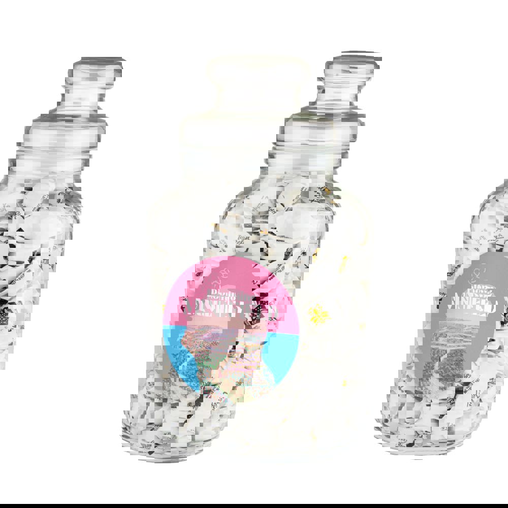 Weckpot 1,5 liter gevuld met ca. 985 gram Engels drop en voorzien van een full colour sticker aan de voorzijde