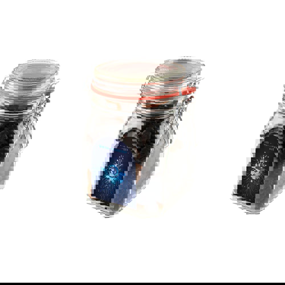Weckpot 0,9 liter gevuld met ca. 675 gram Dropstaafjes mix en voorzien van een full colour sticker aan de voorzijde