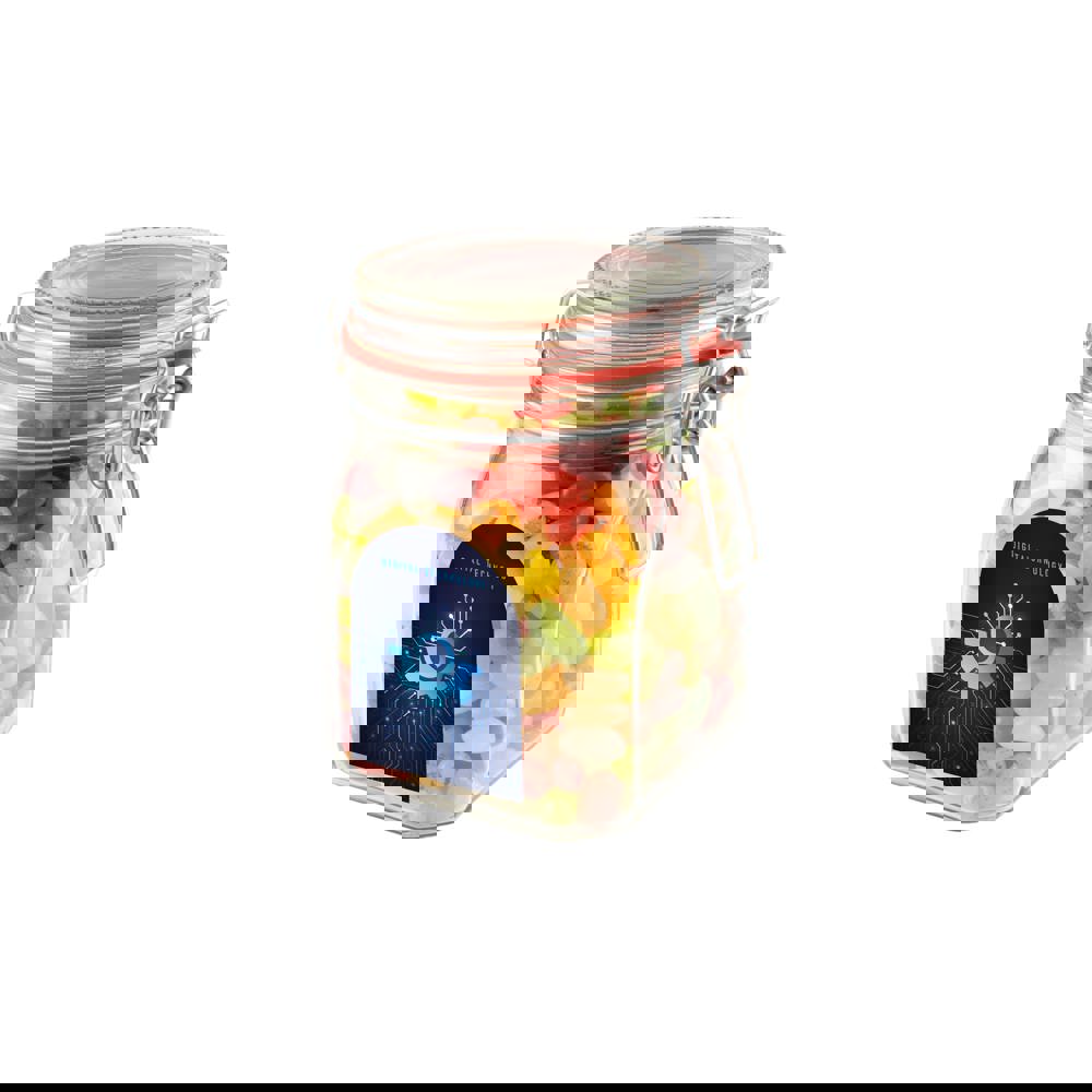 Weckpot 0,9 liter gevuld met ca. 675 gram Dropstaafjes mix en voorzien van een full colour sticker aan de voorzijde