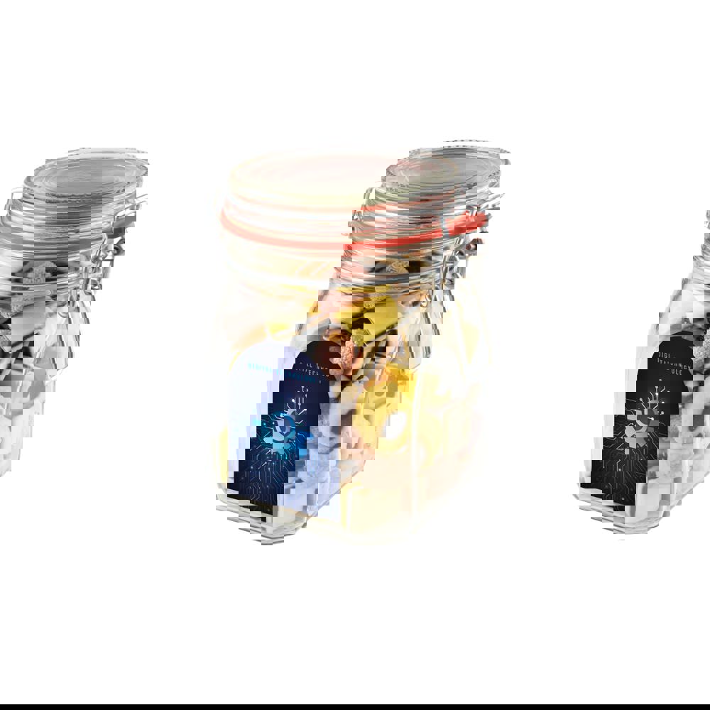 Weckpot 0,9 liter gevuld met ca. 675 gram Dropstaafjes mix en voorzien van een full colour sticker aan de voorzijde