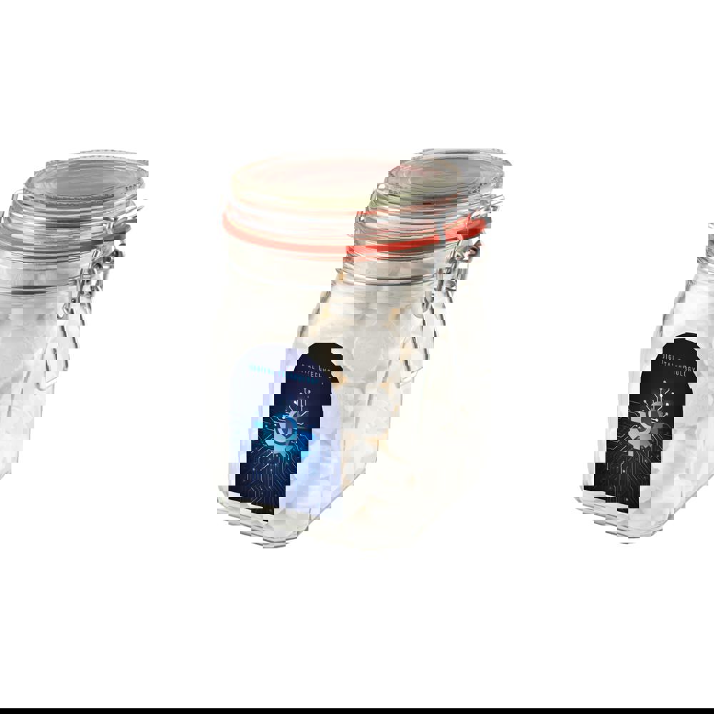 Weckpot 0,9 liter gevuld met ca. 675 gram Dropstaafjes mix en voorzien van een full colour sticker aan de voorzijde