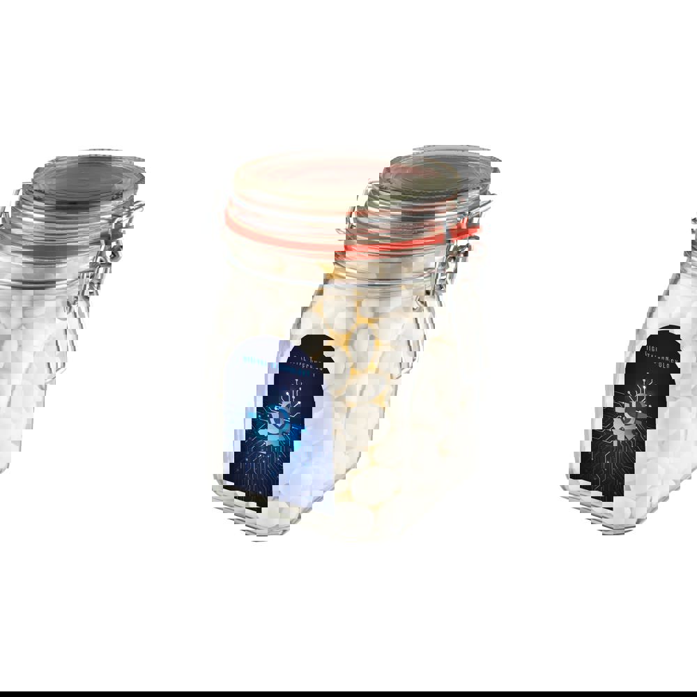 Weckpot 0,9 liter gevuld met ca. 675 gram Dropstaafjes mix en voorzien van een full colour sticker aan de voorzijde