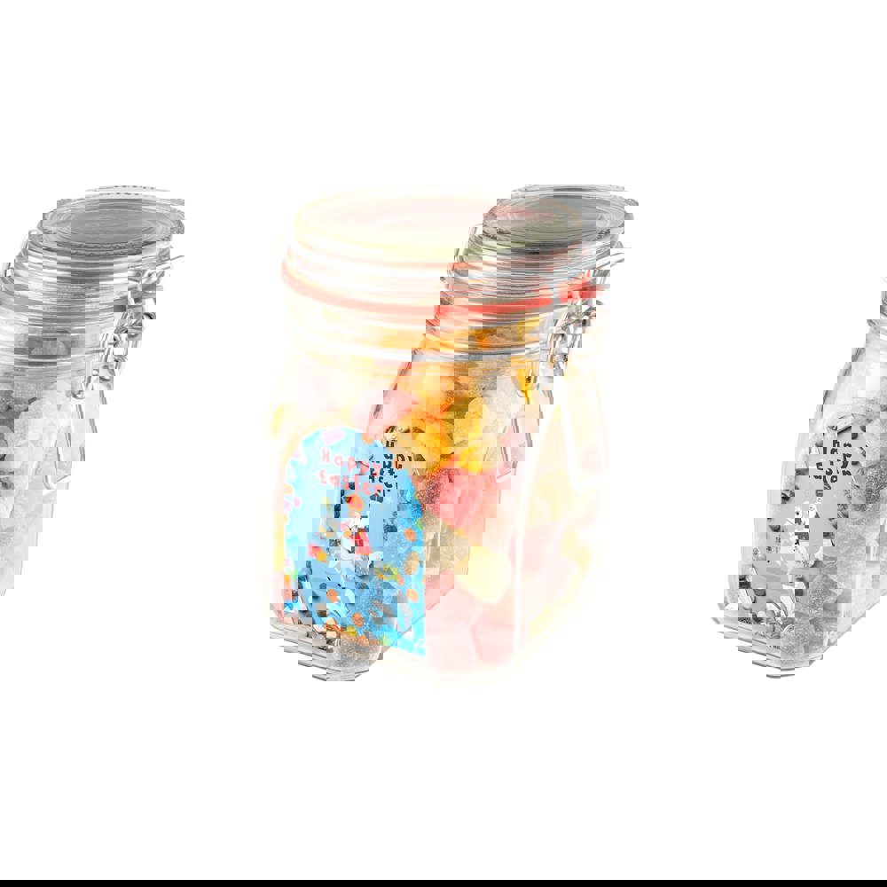 Weckpot 0,9 liter gevuld met ca. 675 gram Dropstaafjes mix en voorzien van een full colour sticker aan de voorzijde