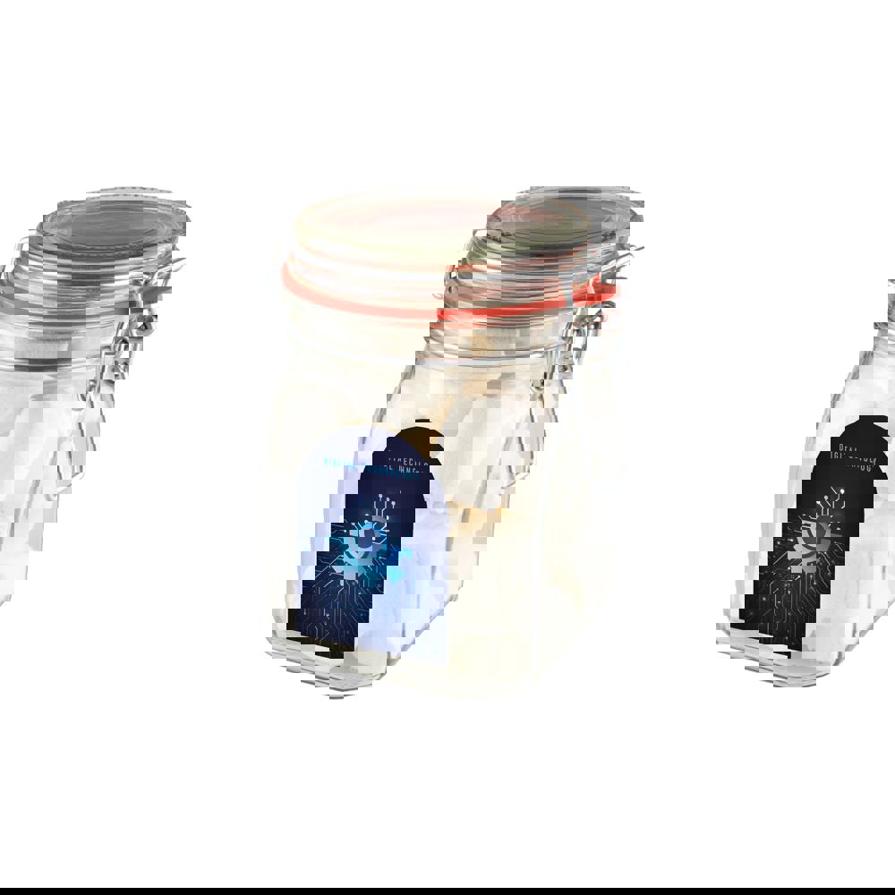 Weckpot 0,9 liter gevuld met ca. 675 gram Dropstaafjes mix en voorzien van een full colour sticker aan de voorzijde