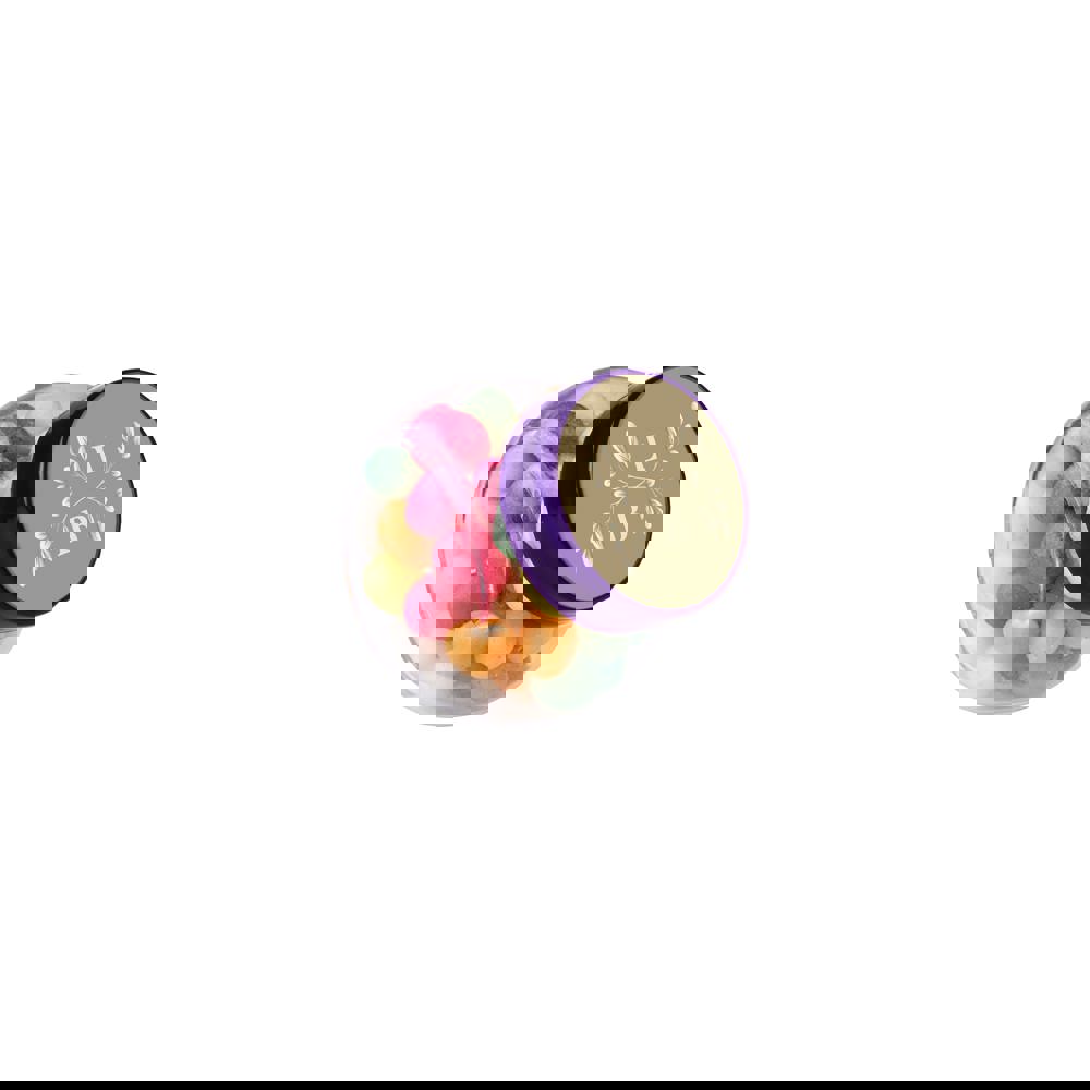 Micro glazen potje 50 ml met wit deksel, voorzien van een full colour sticker op het deksel en gevuld met metallic sweets