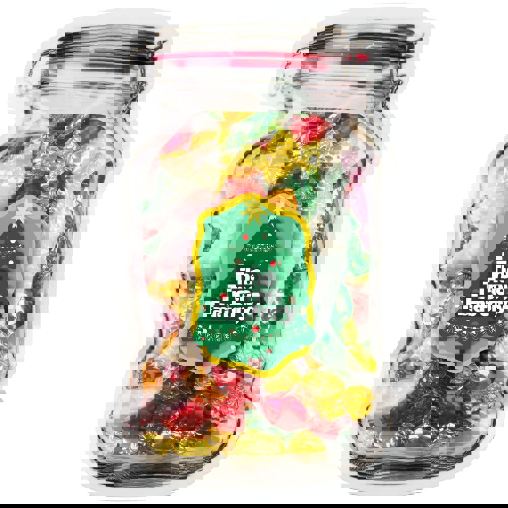 Kleine glazen pot 0,4 liter met wit deksel, voorzien van een full colour sticker aan beide zijden en gevuld met ca. 200 gram chocolade paasmix