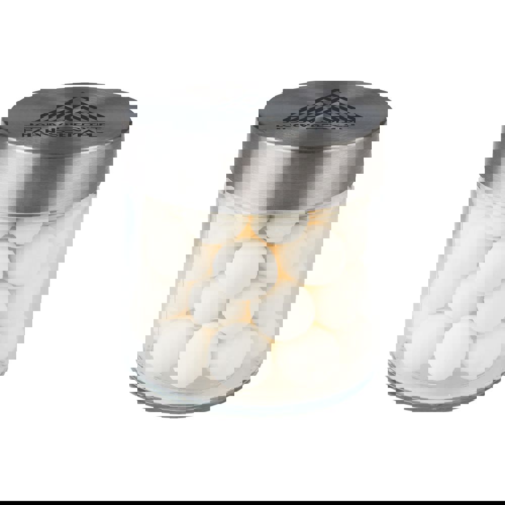 Glazen pot met RVS deksel 0,35 liter voorzien van een full colour digitale bedrukking op het deksel en gevuld met gemengd drop