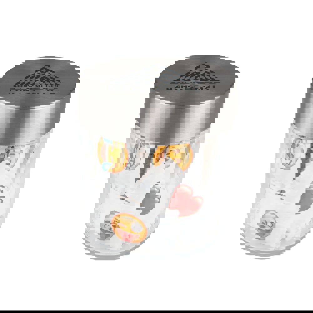 Glazen pot met RVS deksel 0,35 liter voorzien van een full colour digitale bedrukking op het deksel en gevuld met gemengd drop