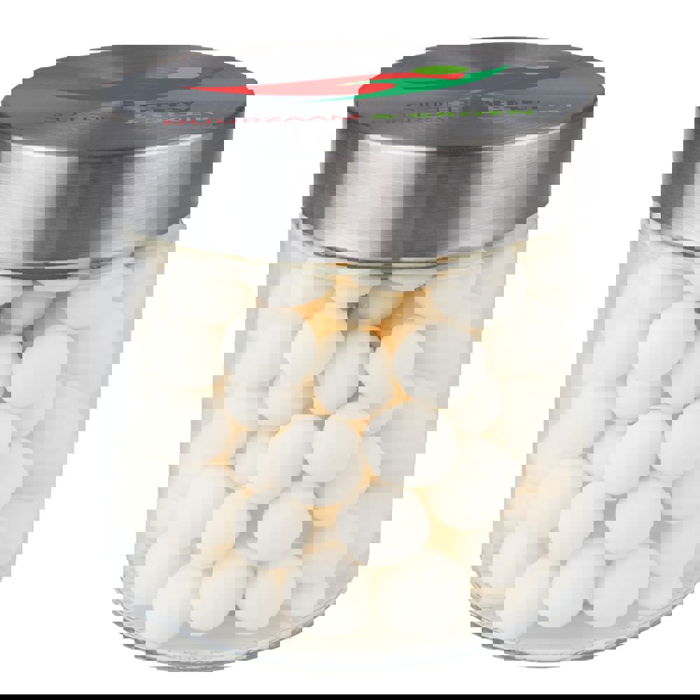 Glazen pot met RVS deksel 0,9 liter voorzien van een full colour digitale bedrukking op het deksel en gevuld met gemengd drop