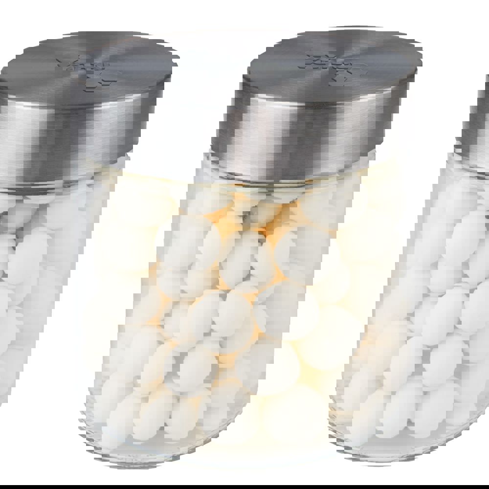 Glazen pot met RVS deksel 0,9 liter voorzien van embossing op het deksel en gevuld met gemengd drop