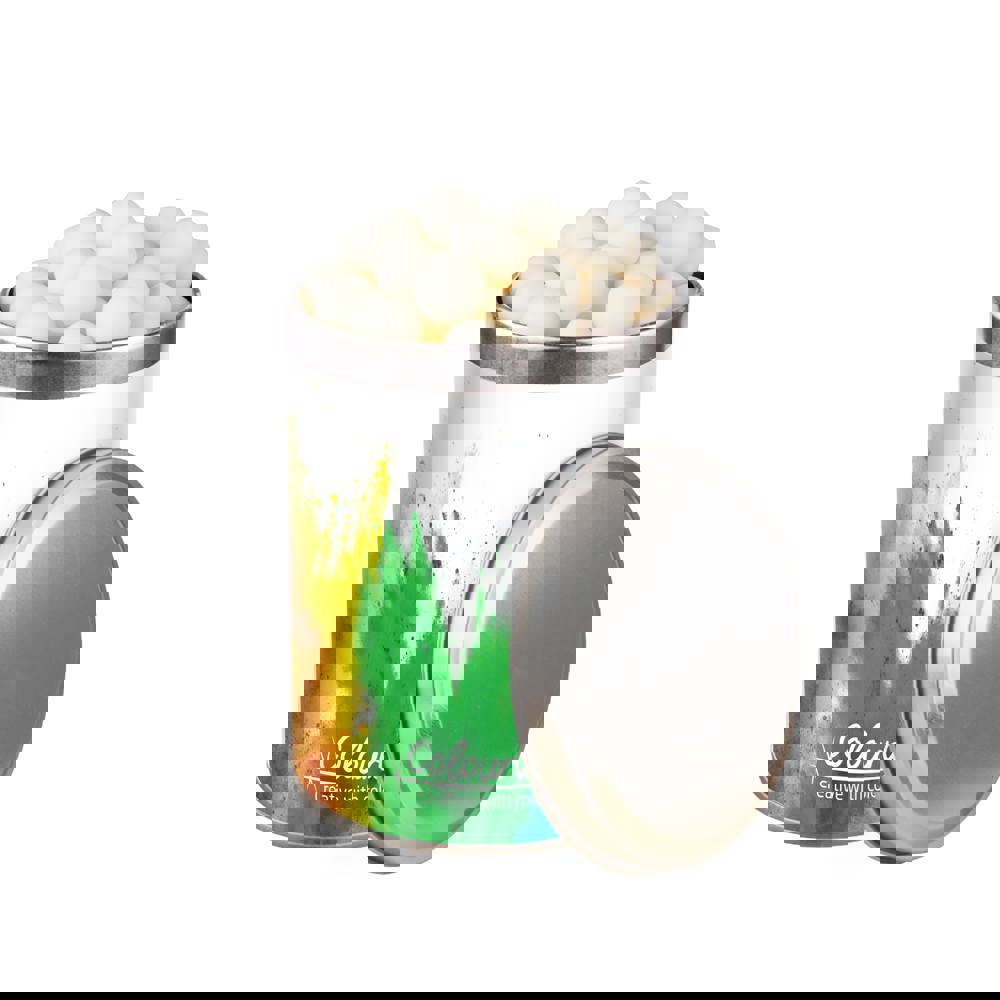 Medium rond blik, 0,9 liter gevuld met ca. 650 gram Tum Tum en voorzien van een full colour bedrukte sleeve