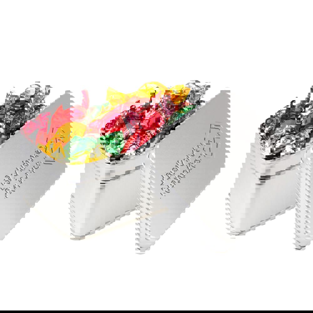 Rechthoekig blik voorzien van een embossing op het deksel gevuld met ca. 300 gram Dropstaafjes mix