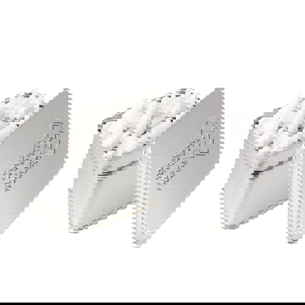 Rechthoekig blik voorzien van een embossing op het deksel gevuld met ca. 300 gram Dropstaafjes mix