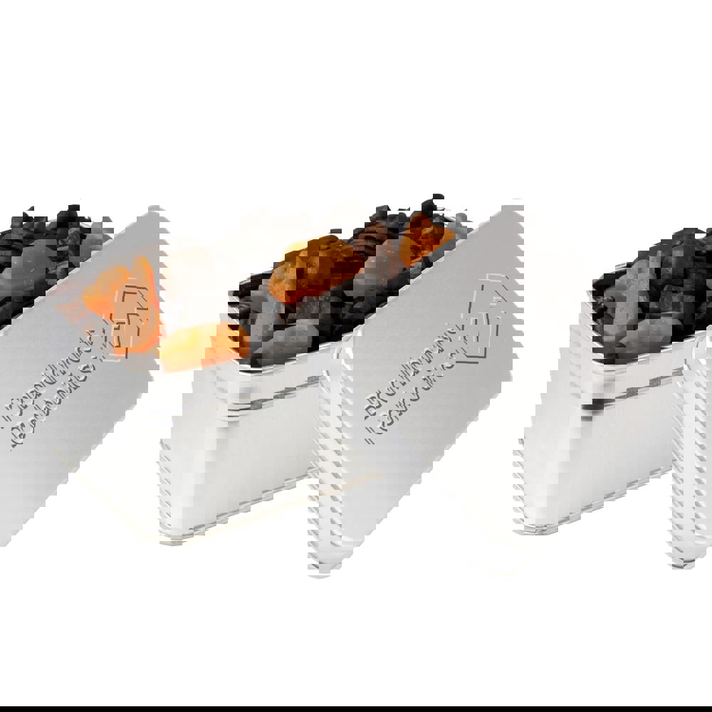 Rechthoekig blik voorzien van een embossing op het deksel gevuld met ca. 300 gram Dropstaafjes mix