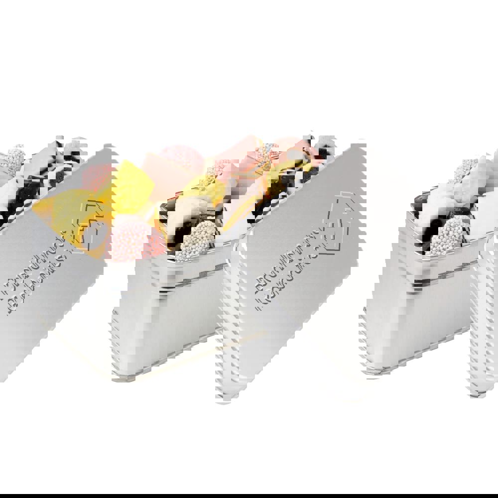 Rechthoekig blik voorzien van een embossing op het deksel gevuld met ca. 300 gram Dropstaafjes mix