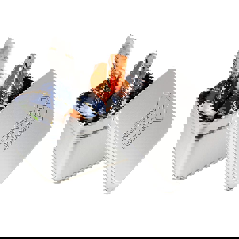 Rechthoekig blik voorzien van een embossing op het deksel gevuld met ca. 300 gram Dropstaafjes mix