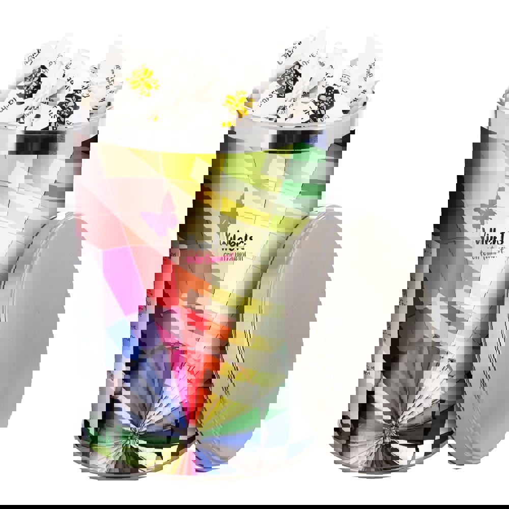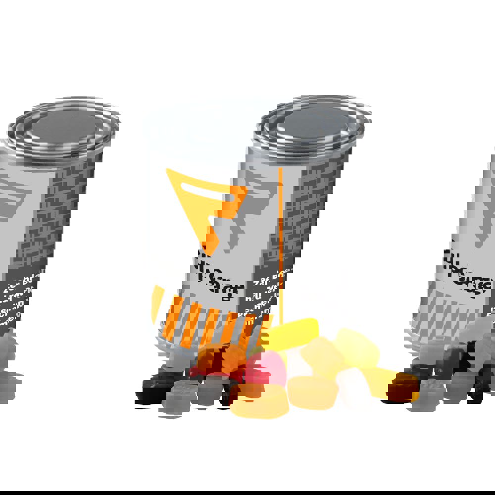 Klein verfblikje met een full colour wikkel, gevuld met ca. 100 gram Winegums