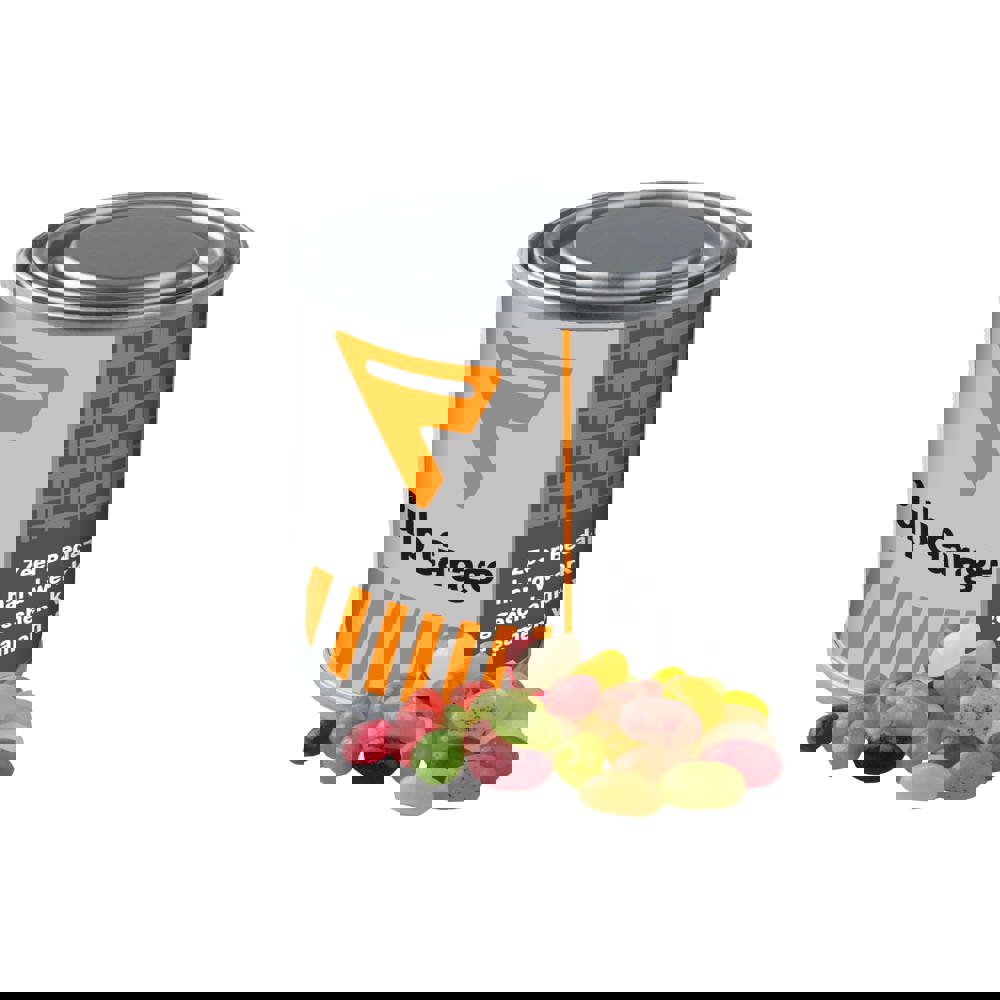 Klein verfblikje met een full colour wikkel, gevuld met ca. 100 gram Winegums