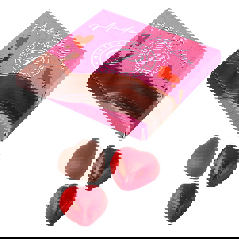 Groot, plat vierkant doosje met een full-colour all-over bedrukking, gevuld met 10 chocolade Paashaasjes in folie
