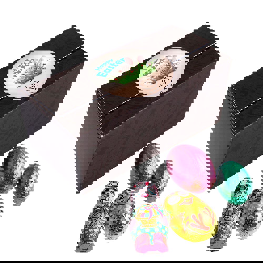 Standaard bedrukt ballotin doosje voorzien van een full colour sticker op het deksel en gevuld met ca. 155 gram Paasmix