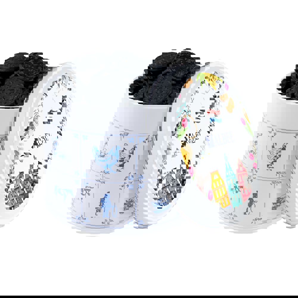 Jute zak gevuld gevuld met ca. 250 gram Strooigoed en voorzien van een full colour dubbelzijdig bedrukt kaartje
