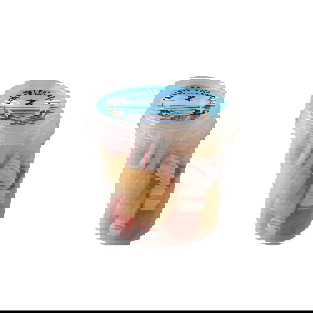 Transparant mini emmertje gevuld met ca. 130 gram Gemengd drop en voorzien van een full colour sticker op het deksel