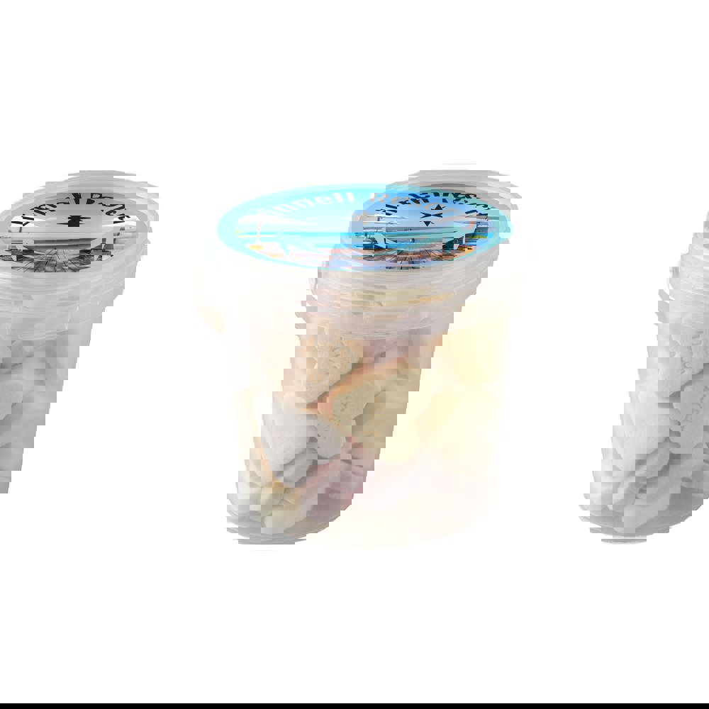 Transparant mini emmertje gevuld met ca. 130 gram Gemengd drop en voorzien van een full colour sticker op het deksel