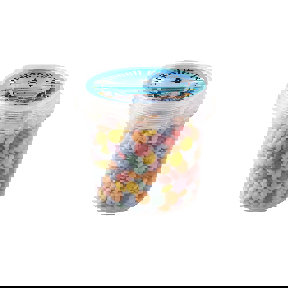 Transparant mini emmertje gevuld met ca. 130 gram Gemengd drop en voorzien van een full colour sticker op het deksel