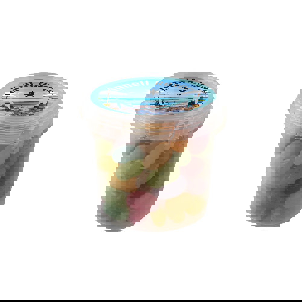 Transparant mini emmertje gevuld met ca. 130 gram Gemengd drop en voorzien van een full colour sticker op het deksel